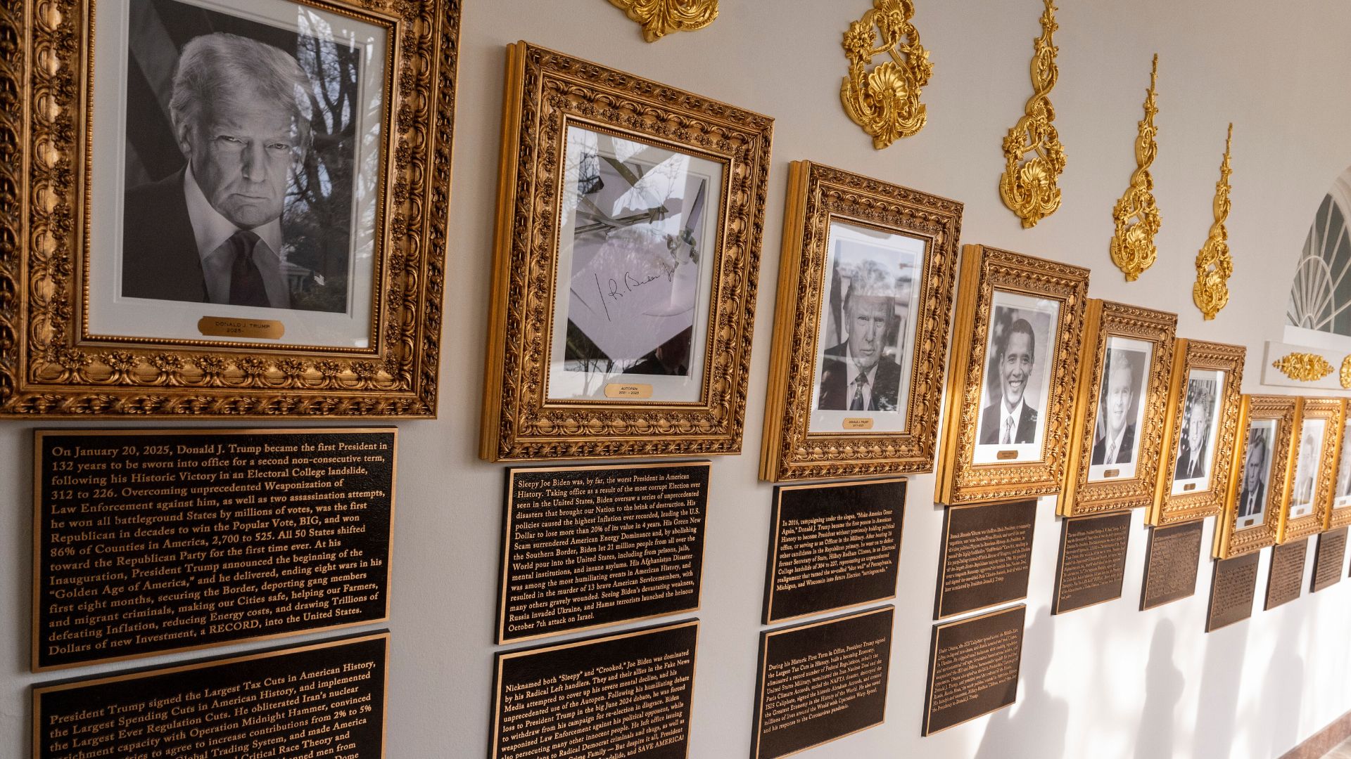 Κάτω από το πορτρέτο του Τραμπ, η βιογραφία του φυσικά τον επισημαίνει ως τον πρόεδρο που έβαλε τέλος σε οκτώ πολέμους σε οκτώ μήνες, μια δήλωση που πιθανώς ανήκει στη σφαίρα της φαντασίας, καθώς επίσης και το ότι προσέφερε τρισεκατομμύρια επενδύσεις στις ΗΠΑ, κάτι που δεν επιβεβαιώνεται.