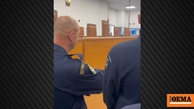 Στο βίντεο μέσα από την αίθουσα του δικαστηρίου, η πρόεδρος της Πλεύσης Ελευθερίας απευθύνεται στους αστυνομικούς που είχαν τοποθετηθεί μπροστά από τα έδρανα των δικηγόρων.