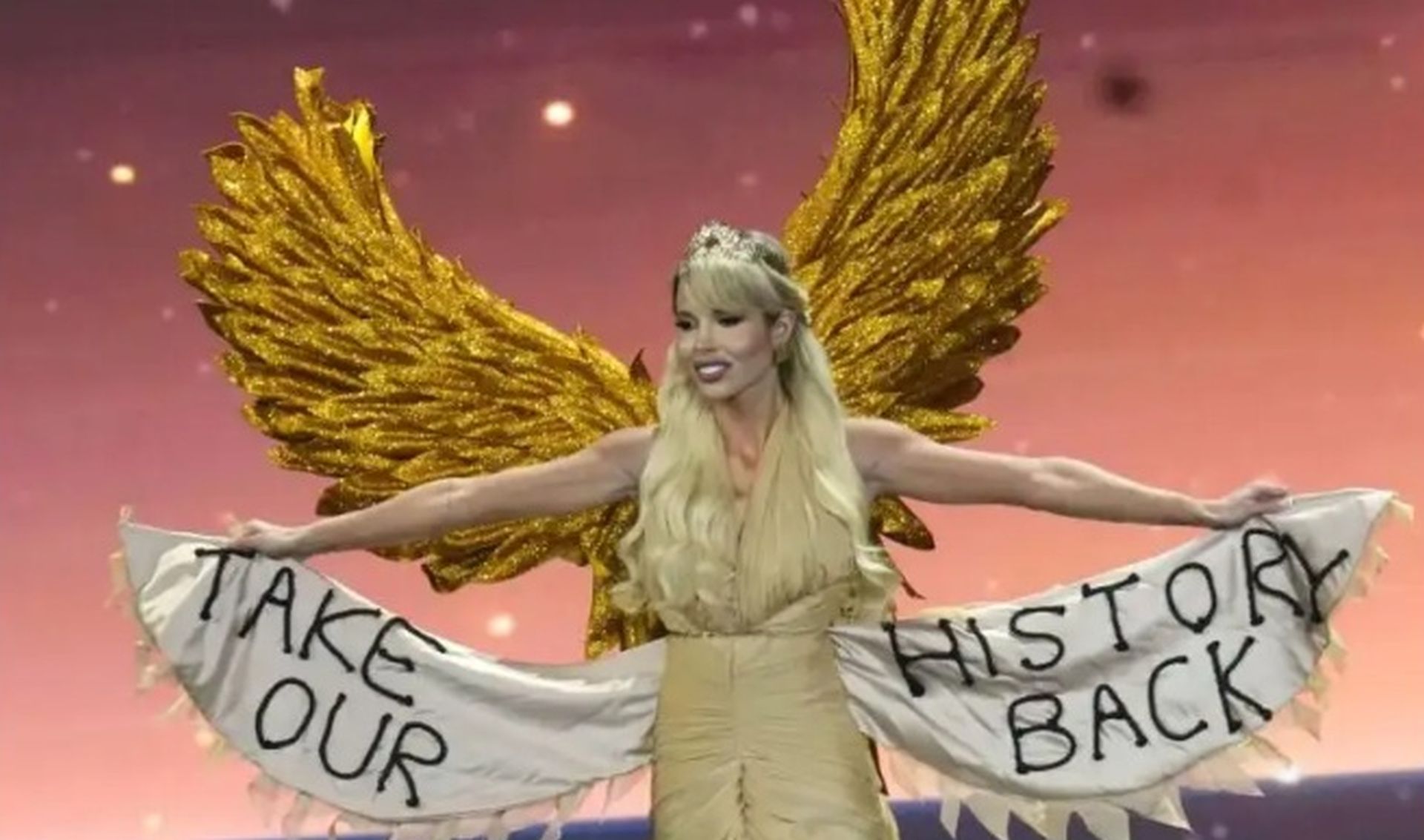 Μάλιστα, όταν άνοιξε την κάπα της εμφανίστηκε η φράση γραμμένη με μαύρα γράμμα «Take Our History Back» (σ.σ. «Φέρτε την ιστορία μας πίσω»).