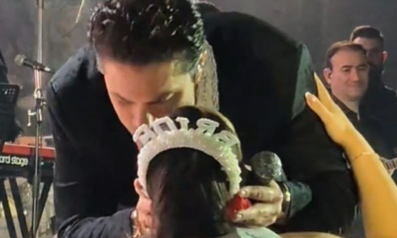 Όπως φαίνεται σε βίντεο που αναρτήθηκε στα social media και έγινε viral, ο τραγουδιστής πλησίασε τη μέλλουσα νύφη και τη φίλησε στο μάγουλο, με την ίδια να μην μπορεί να κρύψει τον ενθουσιασμό της.
