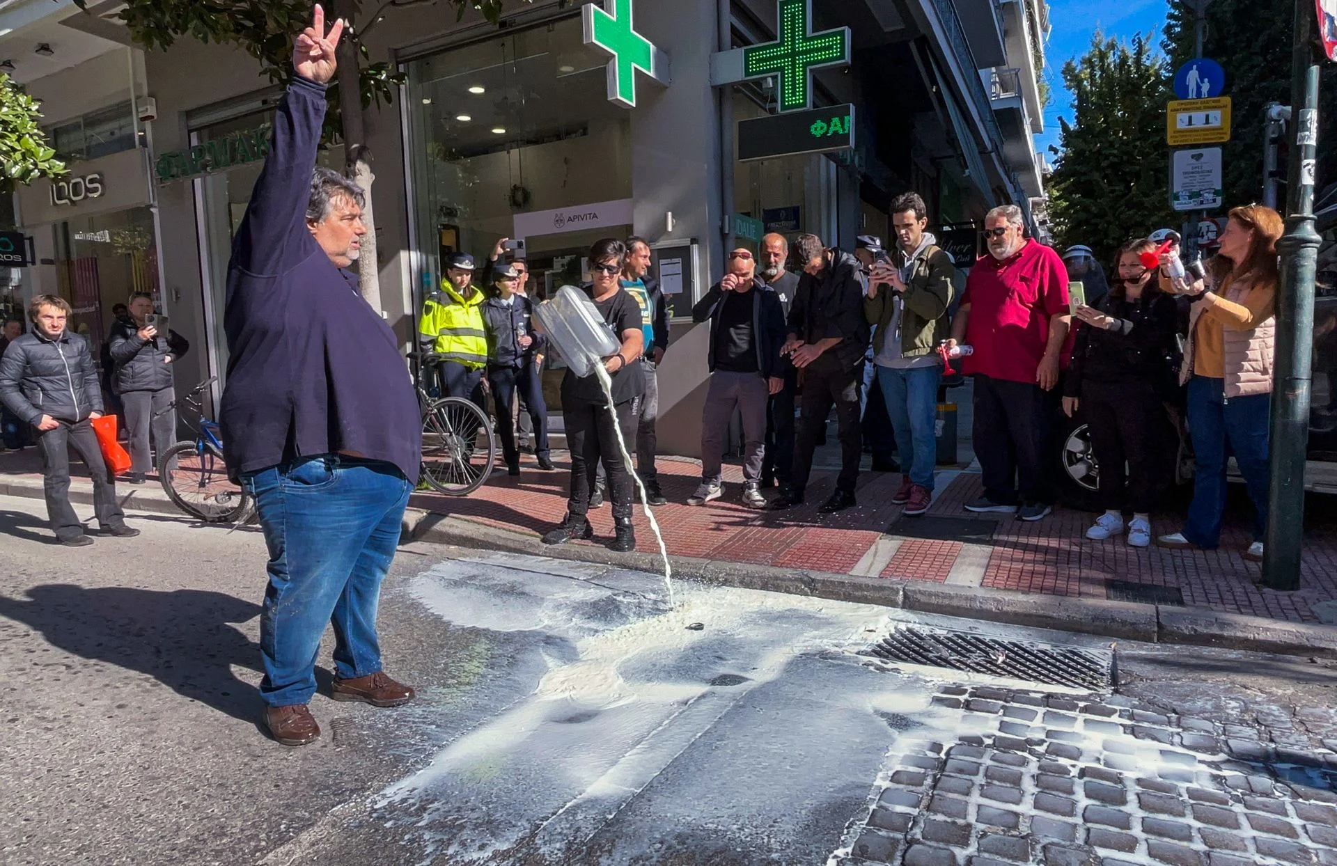 Γάλα έξω από το γραφείο του Χρήστου Κέλλα στη Λάρισα έριξαν κτηνοτρόφοι το πρωί της Πέμπτης, διαμαρτυρόμενοι για την κυβερνητική πολιτική στο κλάδο τους. Αγρότες και κτηνοτρόφοι σε όλη την Ελλάδα πραγματοποιούν κινητοποιήσεις, εκφράζοντας την αδυναμία τους να επιβιώσουν.