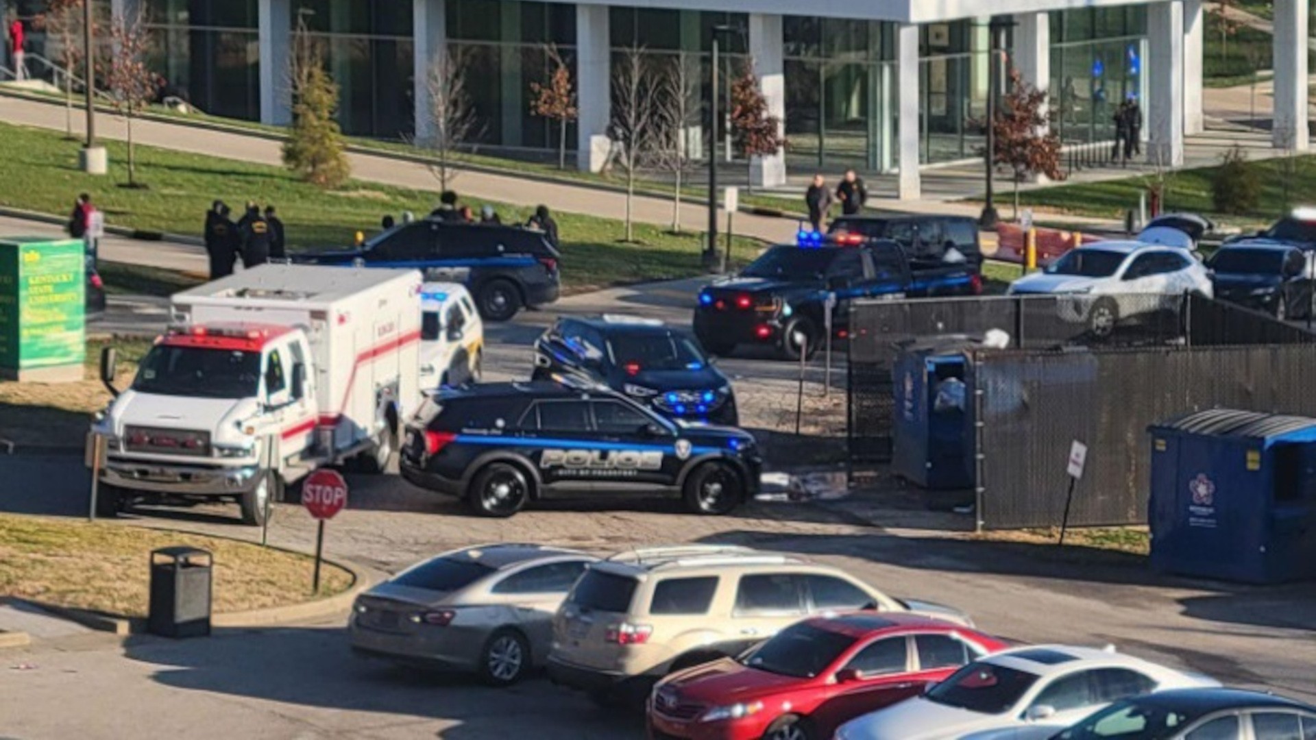Βίντεο που μεταδόθηκε από το WLKY-TV στο Λούισβιλ δείχνει πολλά αστυνομικά οχήματα έξω από τους κοιτώνες και κορδέλες αποκλεισμού σε αυλή.