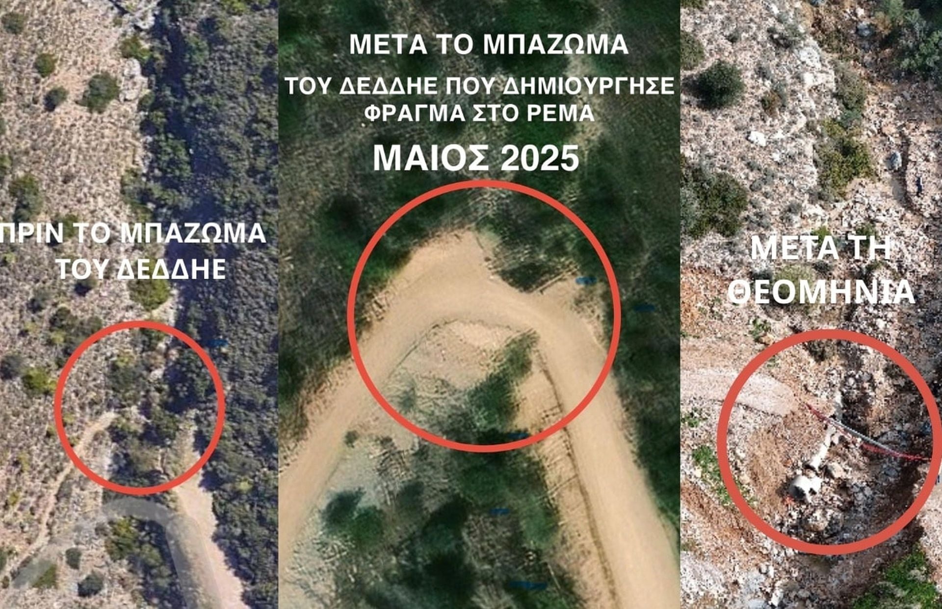 «Για να κάνει το έργο υπογειοποίησης του δικτύου του ο ΔΕΔΔΗΕ τον περασμένο Μάιο στον Υμηττό πάνω από την οδό Μετσόβου στην πόλη μας, μπάζωσε και έκλεισε τη ρεματιά στο σημείο που δείχνουν οι φωτογραφίες, 850 μέτρα περίπου πάνω από την οδό Μετσόβου. Πρόκειται για μπάζωμα μεγέθους 15 μέτρων μήκος, 10 και πλέον μέτρων πλάτος και 8 μέτρων ύψος (δηλαδή τουλάχιστον 1200 κυβικά χώμα και φερτά υλικά)» αναφέρει.
