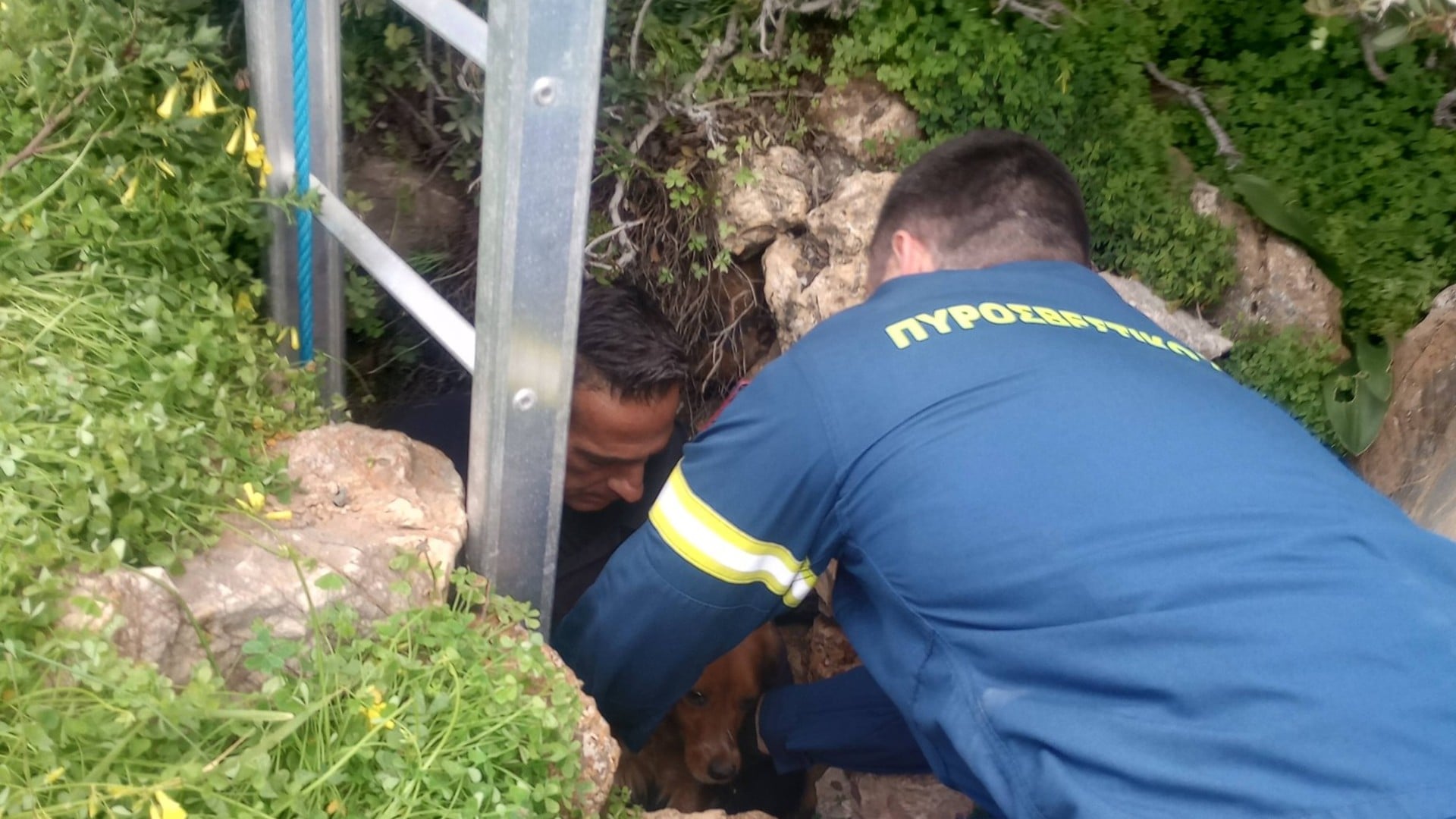 Πυροσβέστης κατέβηκε στο πηγάδι με ειδικό εξοπλισμό και κατάφερε να ανασύρει με ασφάλεια τον σκύλο από το βάθος των 15 μέτρων.