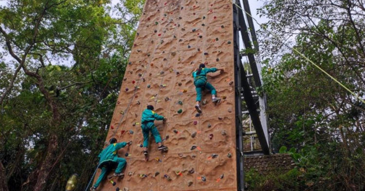 Οι μαθητές κάνουν έξι μαθήματα αναρρίχησης την εβδομάδα και, για να αποφοιτήσουν, πρέπει να καταφέρουν να φτάσουν στην κορυφή αυτού του τοίχου, που έχει ύψος 15 μέτρα.