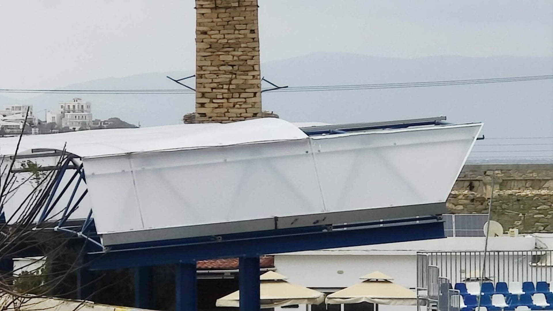 Όπως αποτυπώνεται και σε φωτογραφίες του sportcyclades.gr, ένα τμήμα του στεγάστρου αποσπάστηκε από τη θέση του, χωρίς ευτυχώς να εξέλθει εκτός αγωνιστικού χώρου. Το κομμάτι απομακρύνθηκε άμεσα, ώστε να μην υπάρξει περαιτέρω κίνδυνος.